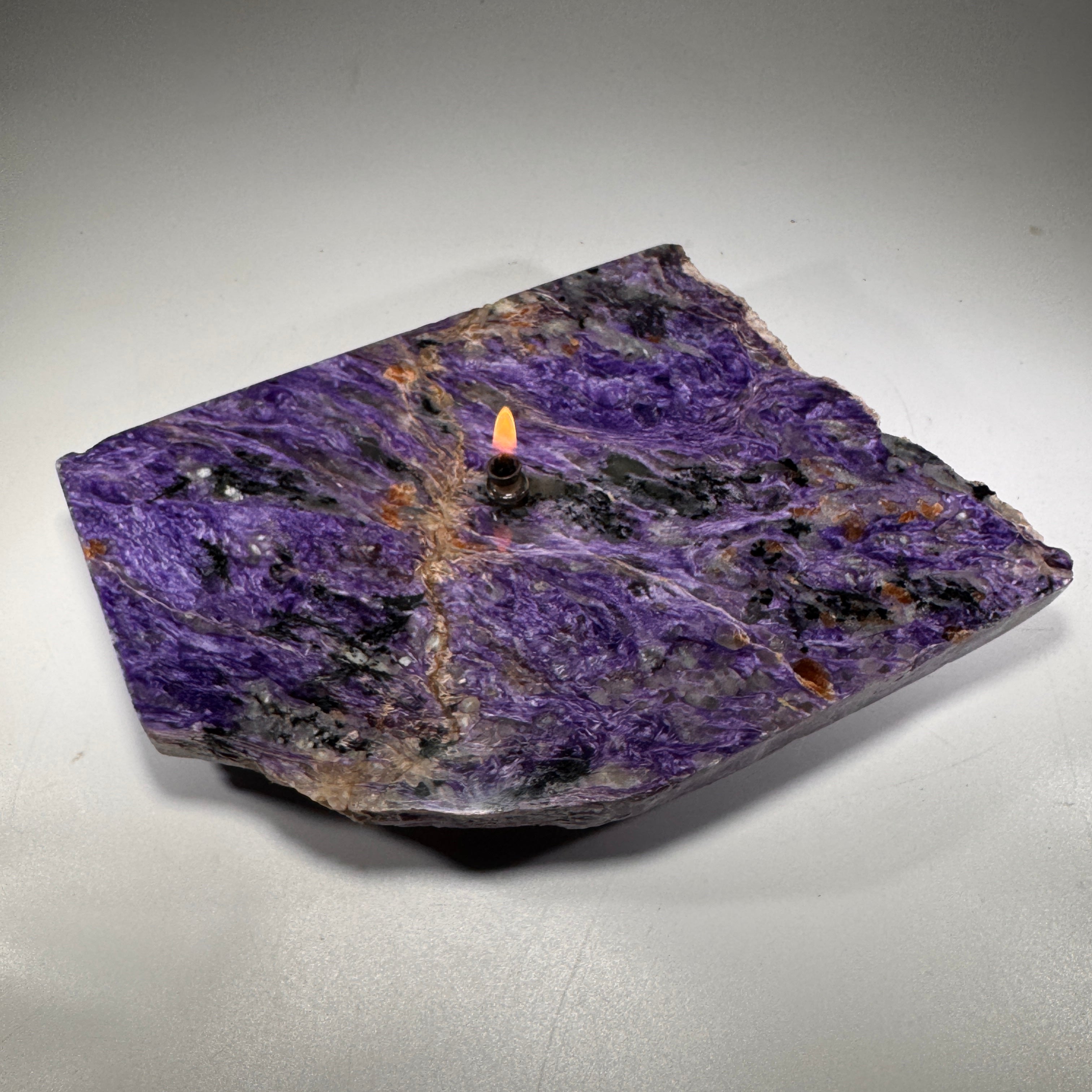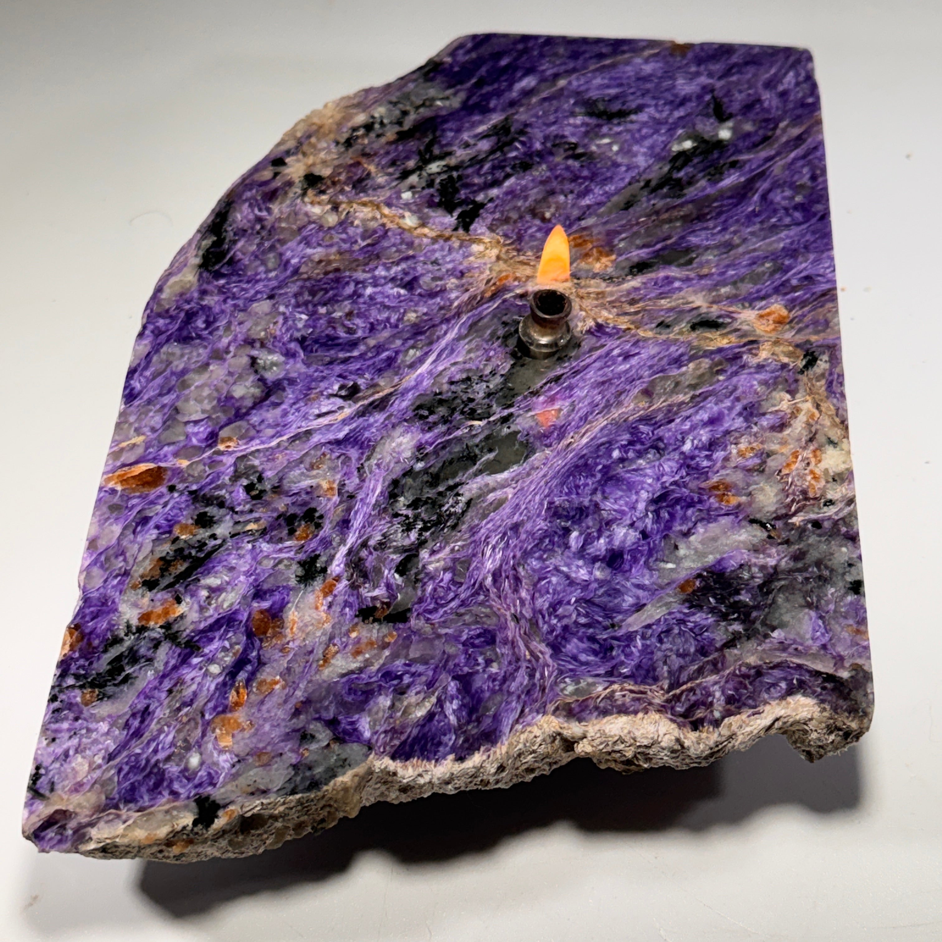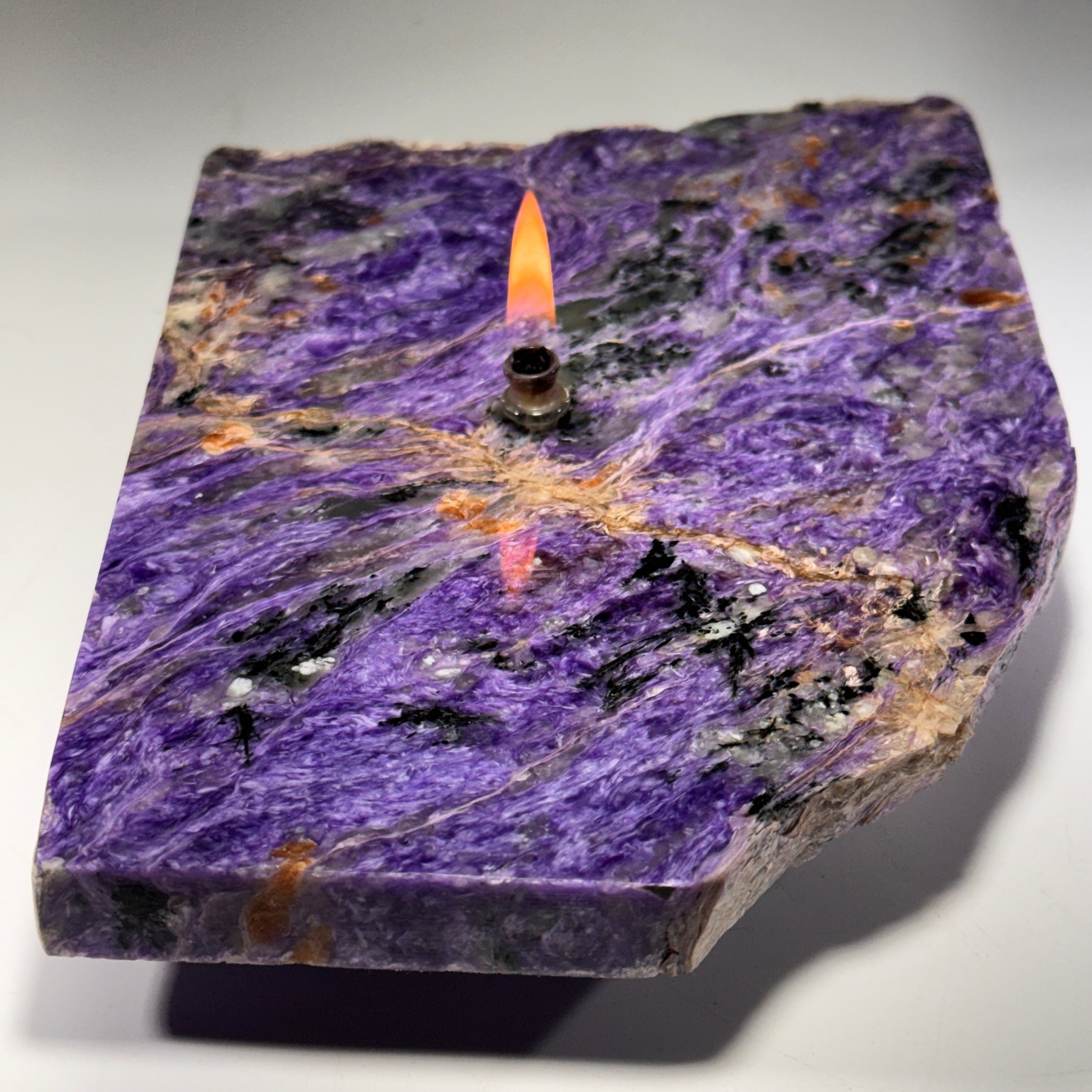 Check out the mesmerizing beauty of Siberian charoite crystal slab transformed into a functional work of art.