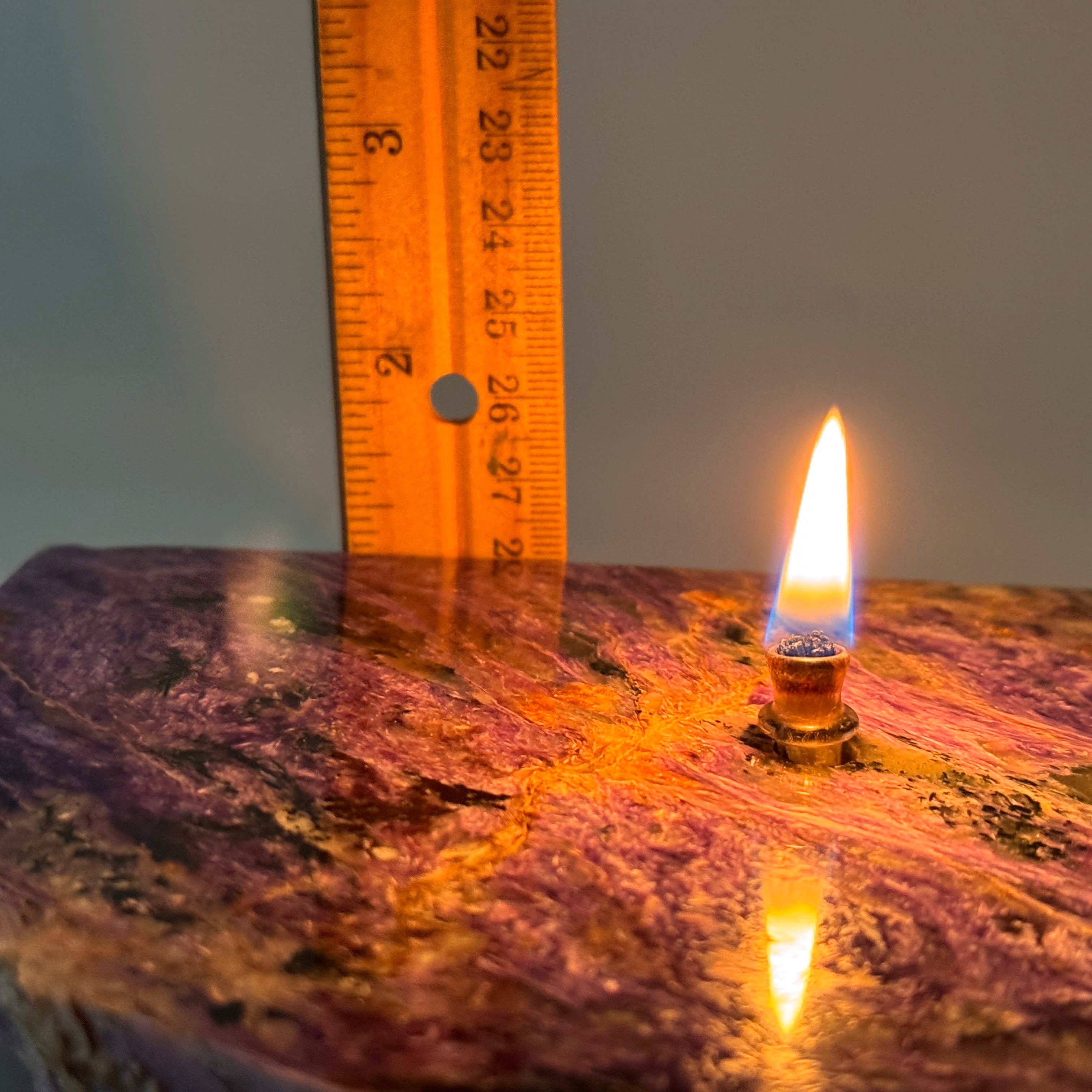 This stunning rock candle features a naturally gorgeous slab with a permanently attached oil reservoir underneath providing at least 4 hours of continuous burn time per fill.