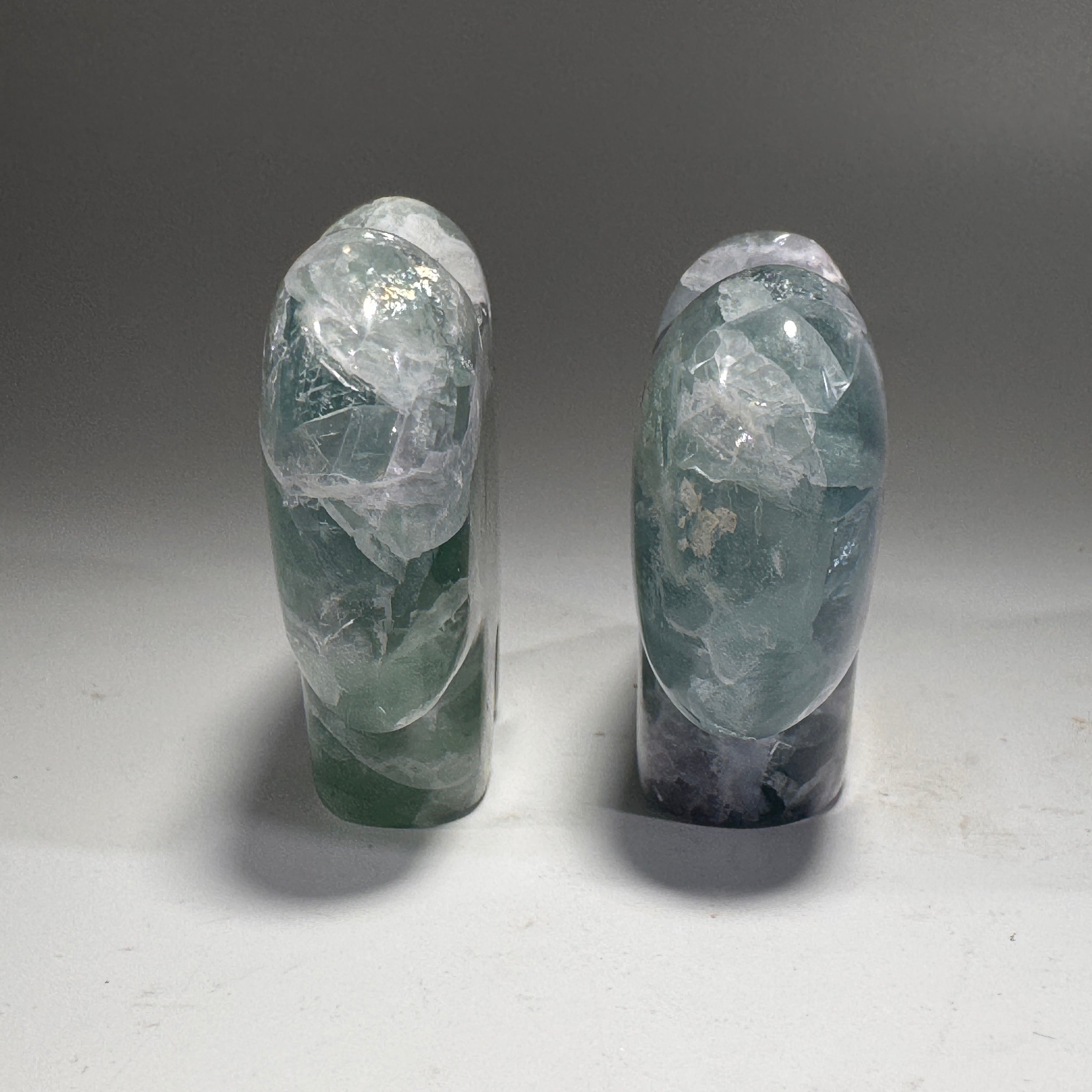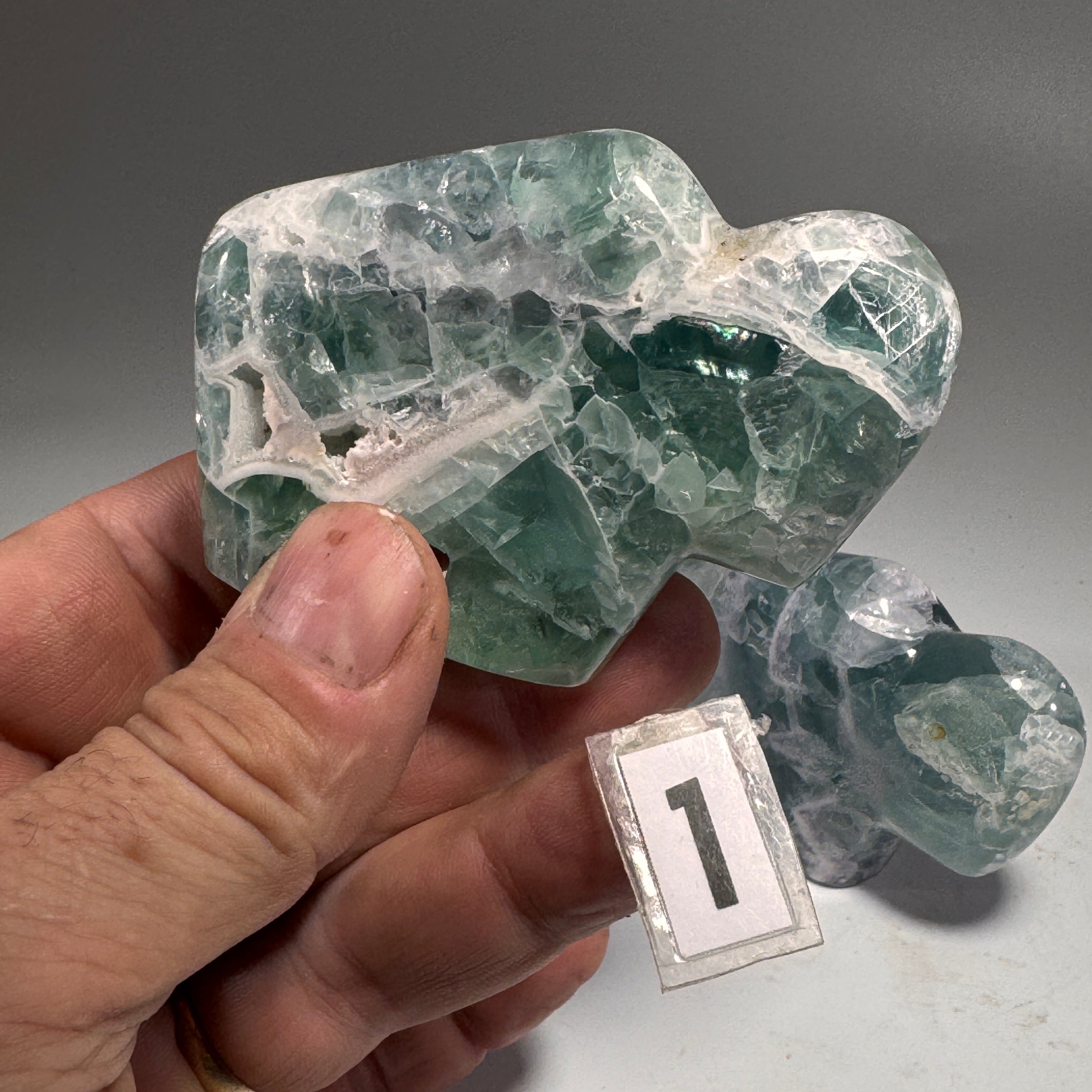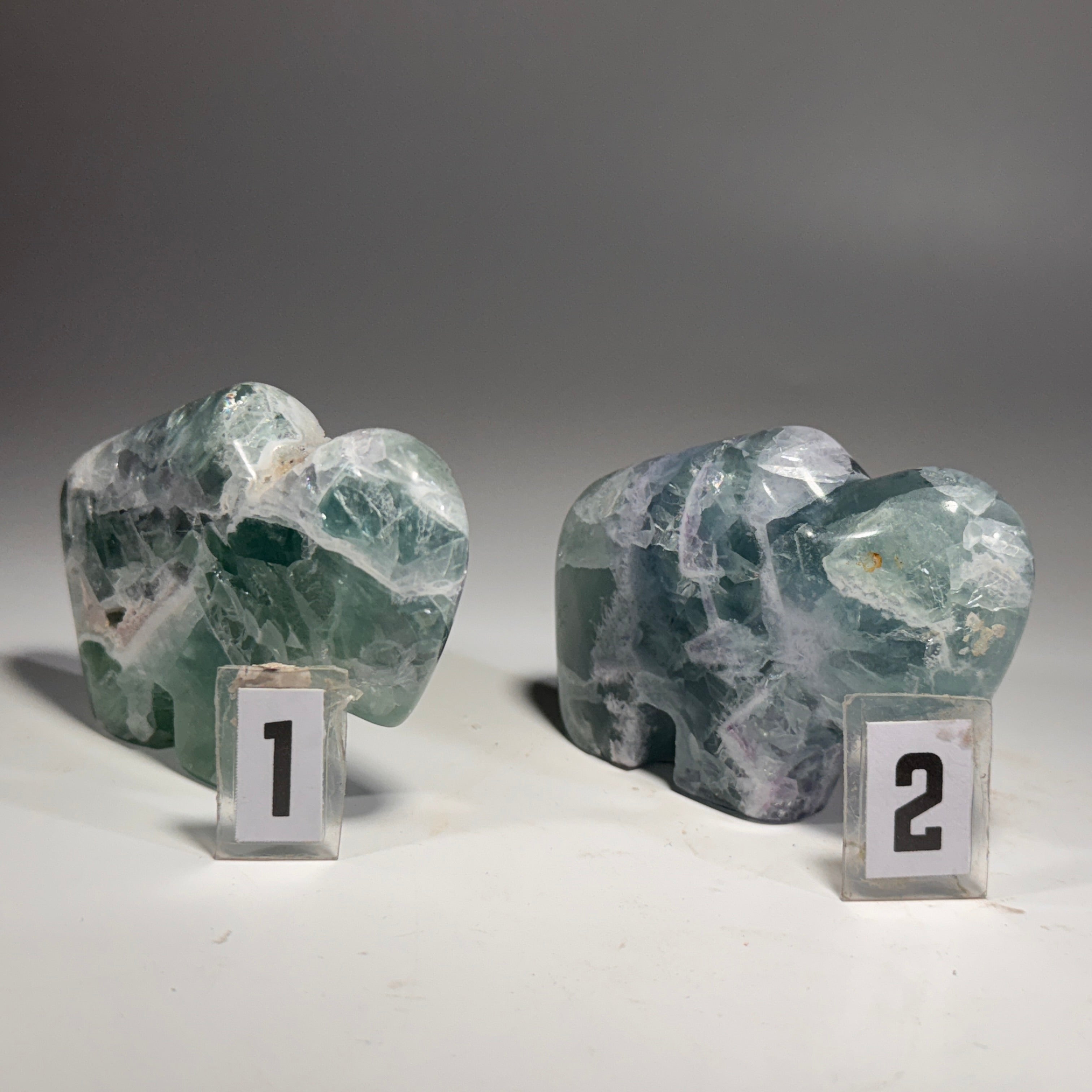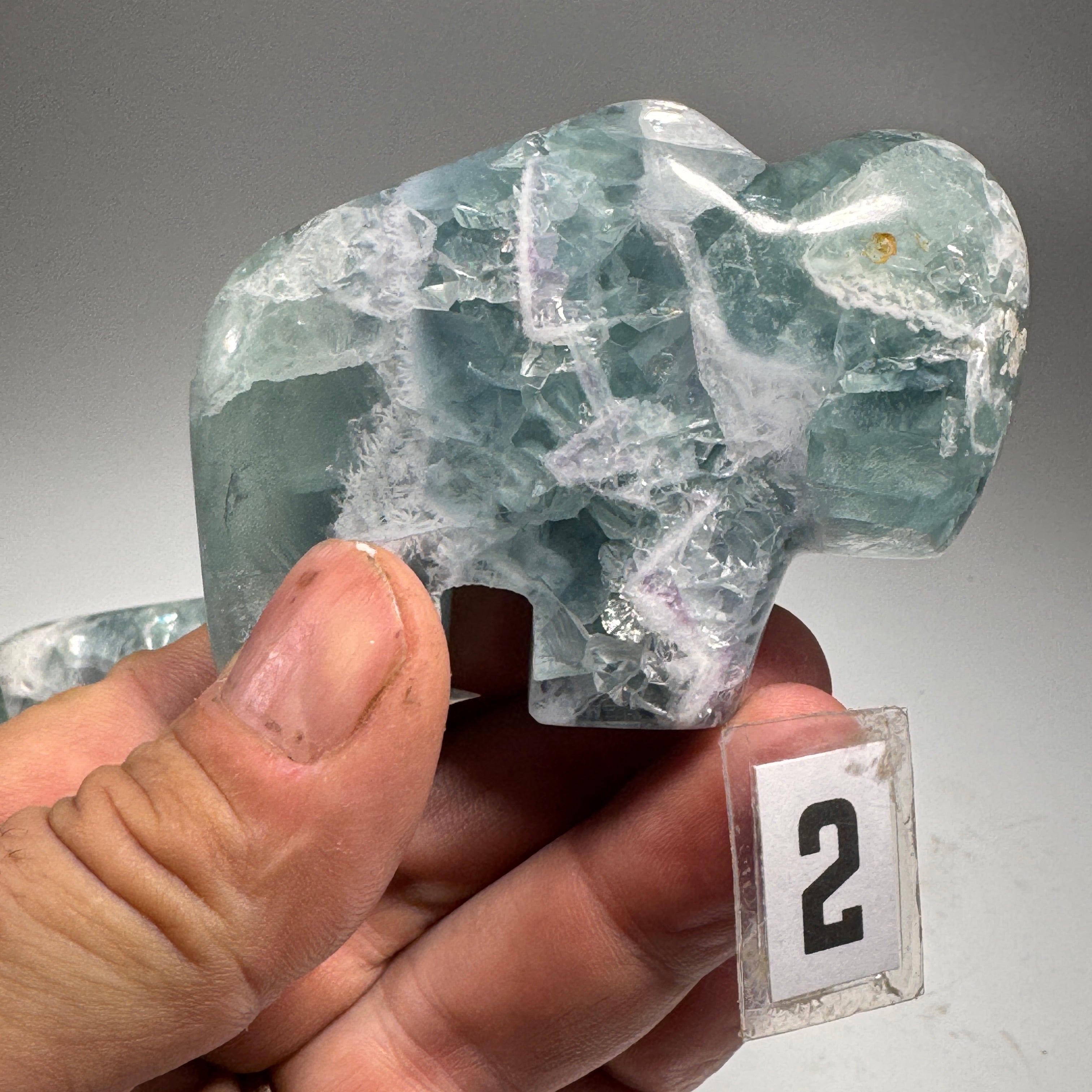 These green fluorite buffalo fetishes, handcarved by a skilled Mexican craftsman, measure about 3.25 by 2.25 inches. Their smooth, polished surface highlights the natural beauty of the stone, making it a unique decorative piece or a meaningful talisman. Perfect for adding a touch of earthy charm to your collection or space.