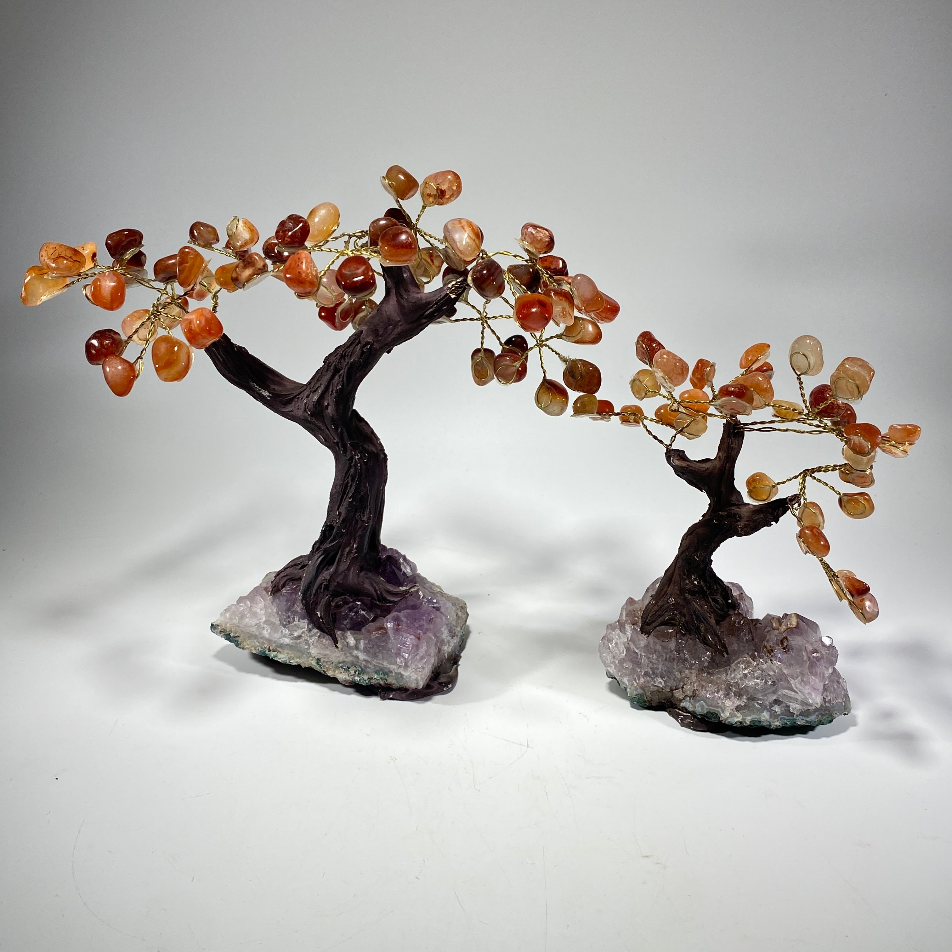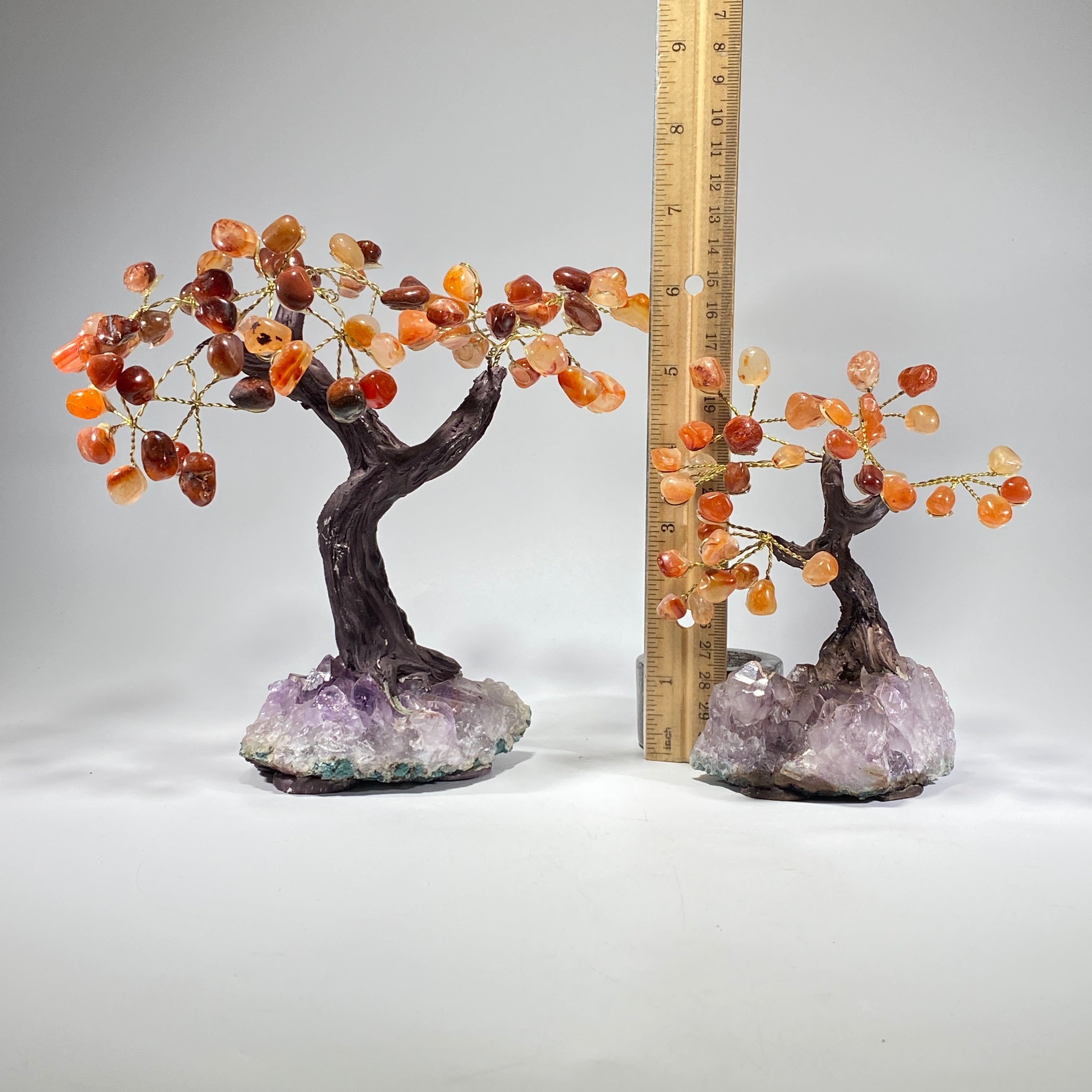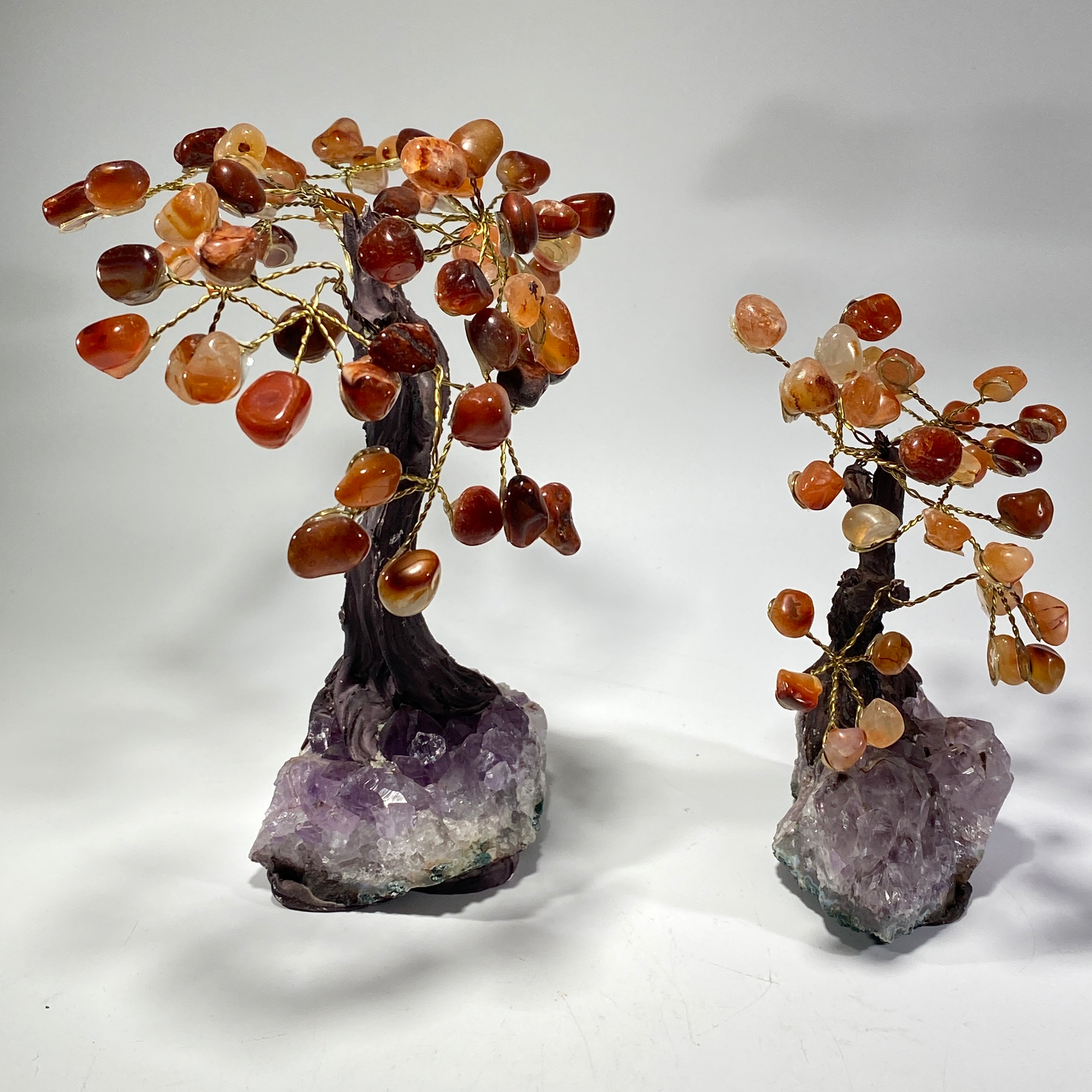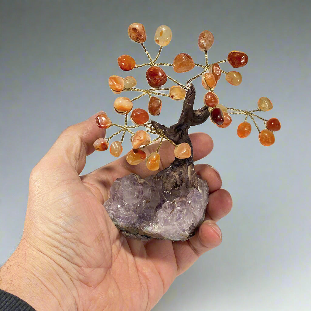 A bonsai tree that you'll never have to prune or water! These gemstone trees are made on an amethyst crystal cluster base with a resin coated wire trunk leading to carnelian wire branches. These pieces are a perfect size to compliment any room at home or in an office without dominating the space. They also make for great gift ideas!