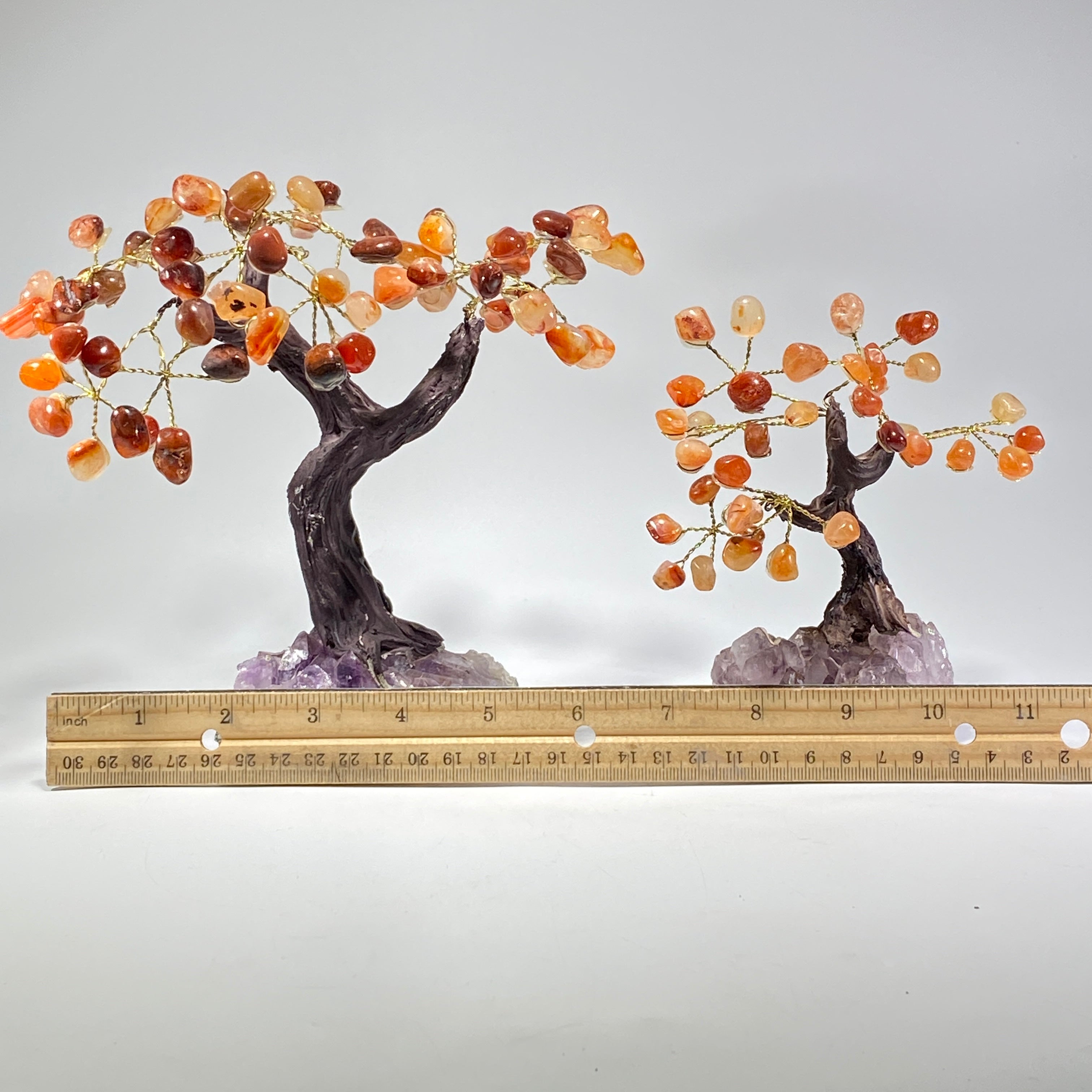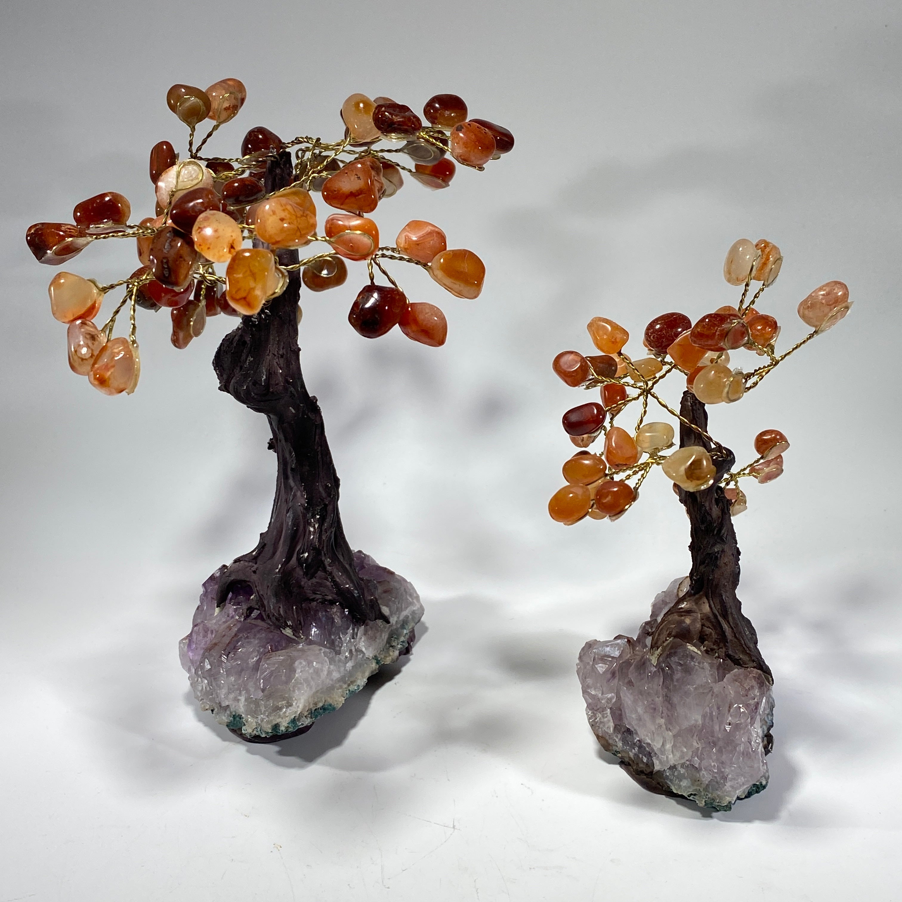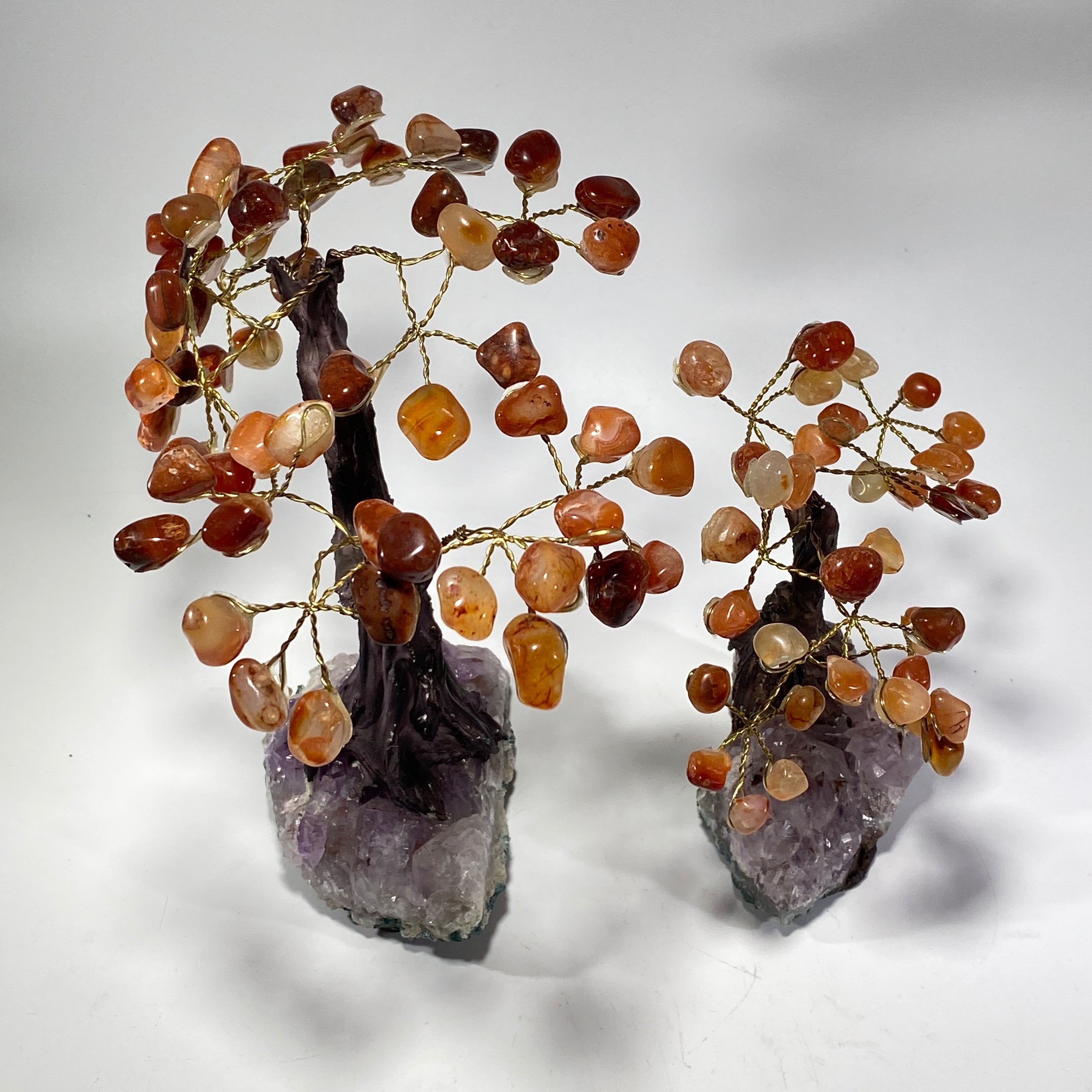 A bonsai tree that you'll never have to prune or water! These gemstone trees are made on an amethyst crystal cluster base with a resin coated wire trunk leading to carnelian wire branches. These pieces are a perfect size to compliment any room at home or in an office without dominating the space. They also make for great gift ideas!