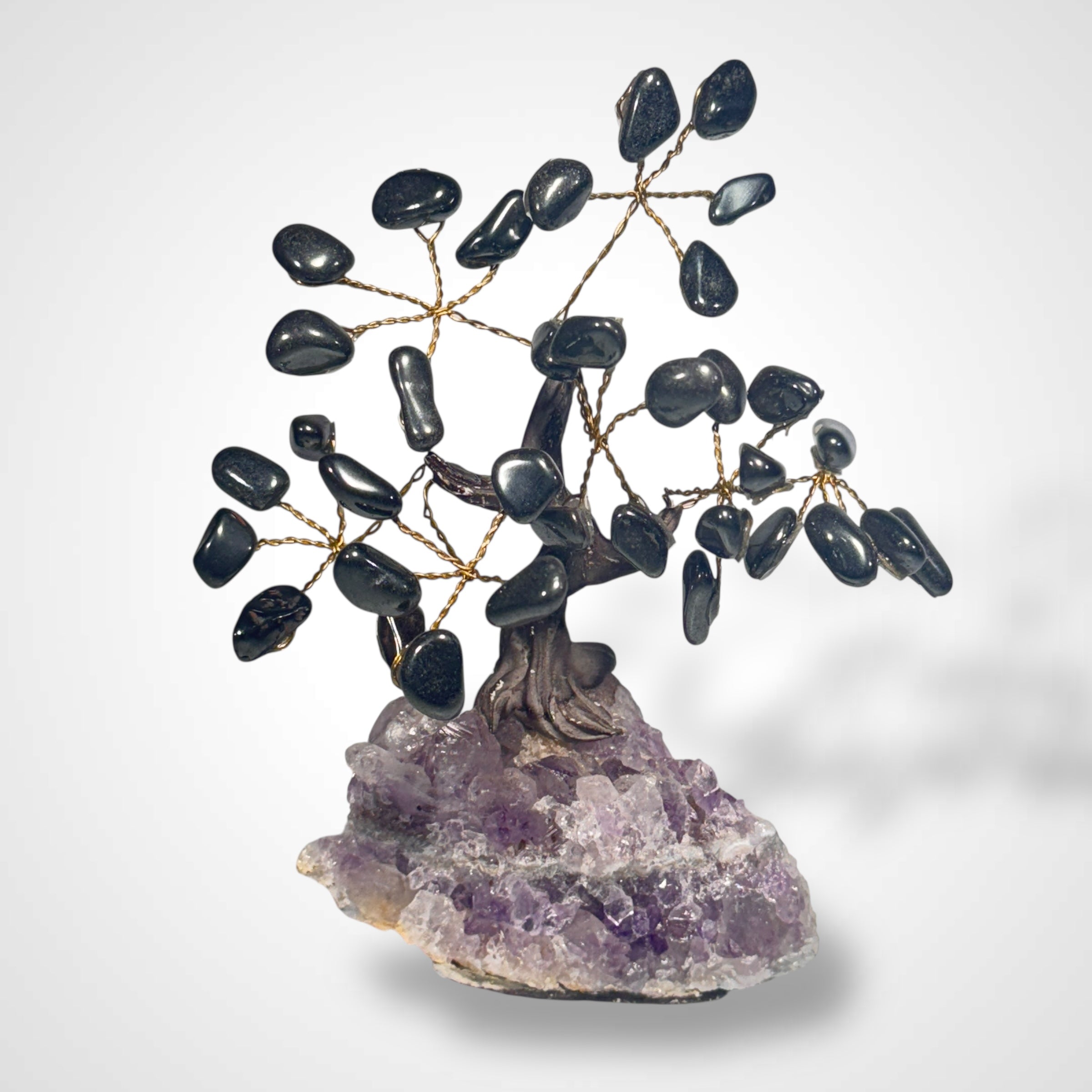 A bonsai tree that you'll never have to prune or water! These gemstone trees are made on an amethyst crystal cluster base with a resin coated wire trunk leading to hematite wire branches. These pieces are a perfect size to compliment any room at home or in an office without dominating the space. They also make for great gift ideas!