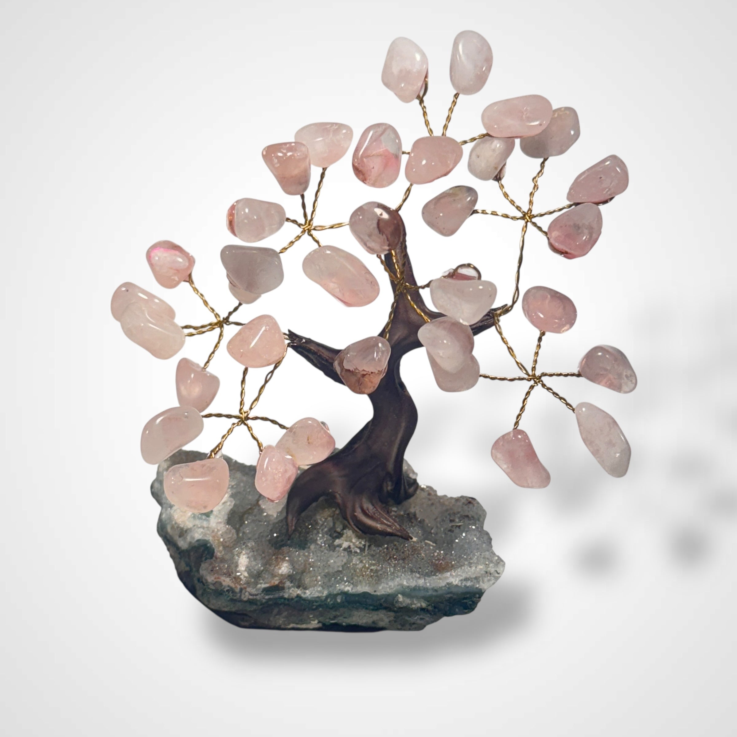 A bonsai tree that you'll never have to prune or water! These gemstone trees are made on an amethyst crystal cluster base with a resin coated wire trunk leading to rose quartz wire branches. These pieces are a perfect size to compliment any room at home or in an office without dominating the space. They also make for great gift ideas!